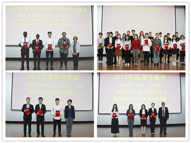 At the end of the ceremony, the college held a commendation ceremony to honor the “Outstanding Overseas Student Volunteers” of the Overseas Education Institute in 2018, and awarded the 2018 International College IELTS High Score Award, also, to recognize groups and individuals with outstanding performance in innovative competitions and cultural and sports activities, which included the project team Qichen Inheritance Education Public Welfare Fund consist of undergraduate student LAN Zijun and other four students, the International College Men's Basketball Team, 2015 undergraduate student SU Bo, who won the fourth national Internet + College Innovation and Entrepreneurship Competition Gold Award, BAI Tingli, who won the third prize in the second national competition of the Chinese Heroes Chinese Teaching Contest, and the excellent guidance Teacher XIAO Ningyao, JIANG Huiyin, the Best Popularity Award winner in the 3rd China University Student Sommelier Contest, and the instructor SHI Fengxia.