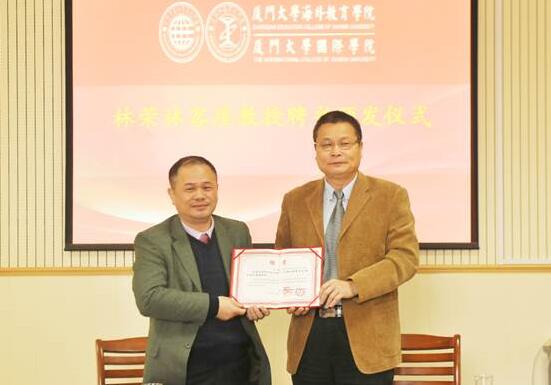 On 30th December, the president of HUTCHISON RUNHUA in Shenzhen, Mr. Lin Ronglin, was invited and employed as visiting professor of International College/Overseas Education College, Xiamen University. The ceremony was held in Room B509 of Kunluan Building. Dean Prof. Zheng Tongtao awarded the appointment letter to President Lin Ronglin and bestowed school badge.