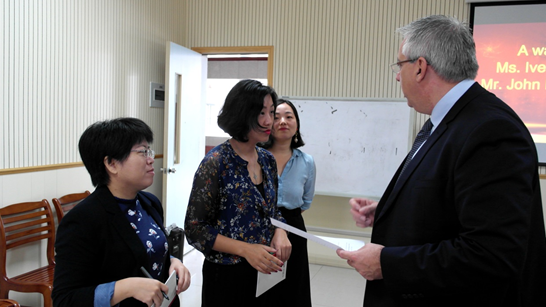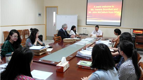 Vice Dean Mr. Lv Zixuan, coordinator Chen Jianru, lecturer Yang Shuai and all staff from professional teaching and researching team met with the examiners Ms.Iverene Bromfield and Mr. John McCallum. Vice Dean Mr. Lv introduced the program and the, and hoped the examiners would make suggestions for the program.