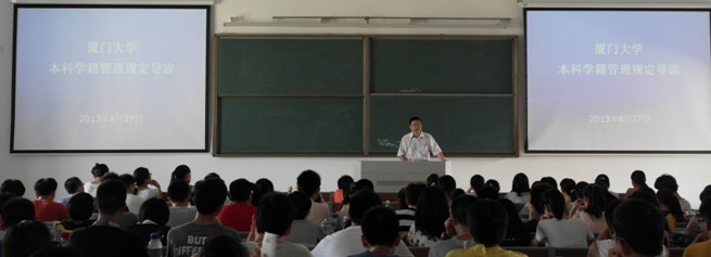 The afternoon of August 27th, overseas education college / International Institute Vice President Lv Zixuan in the Xiangan campus, the main building 1 floor C401 for students of grade 2013 in our school opened in Dublin project entitled the provisions on the administration of undergraduate student lecture introduction <>, membership management regulations of Xiamen University to do the interpretation carefully.