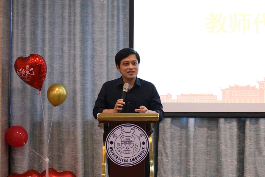 Then, Associate Professor Hong Bin,as the teacher representative delivered a speech. He humorously extended from Xiamen Fuyu duck porridge to the "speech in preparation for Xiamen University" delivered by Mr. Tan Kah Kee, the founder of XMU, at the sponsors’ meeting at Chen's ancestral temple in Fuyu, Xiamen. "Today, the state of the country is in peril, and what can rely on is only the education of the country and the hearts the people..." he taught the students to uphold the spirit of Mr Tan Kah Kee and stick to the feelings of home and country; We should not forget our roots, and not to forget the national foundation, hometown, parents, teachers, friends who help, and the road when we came.
