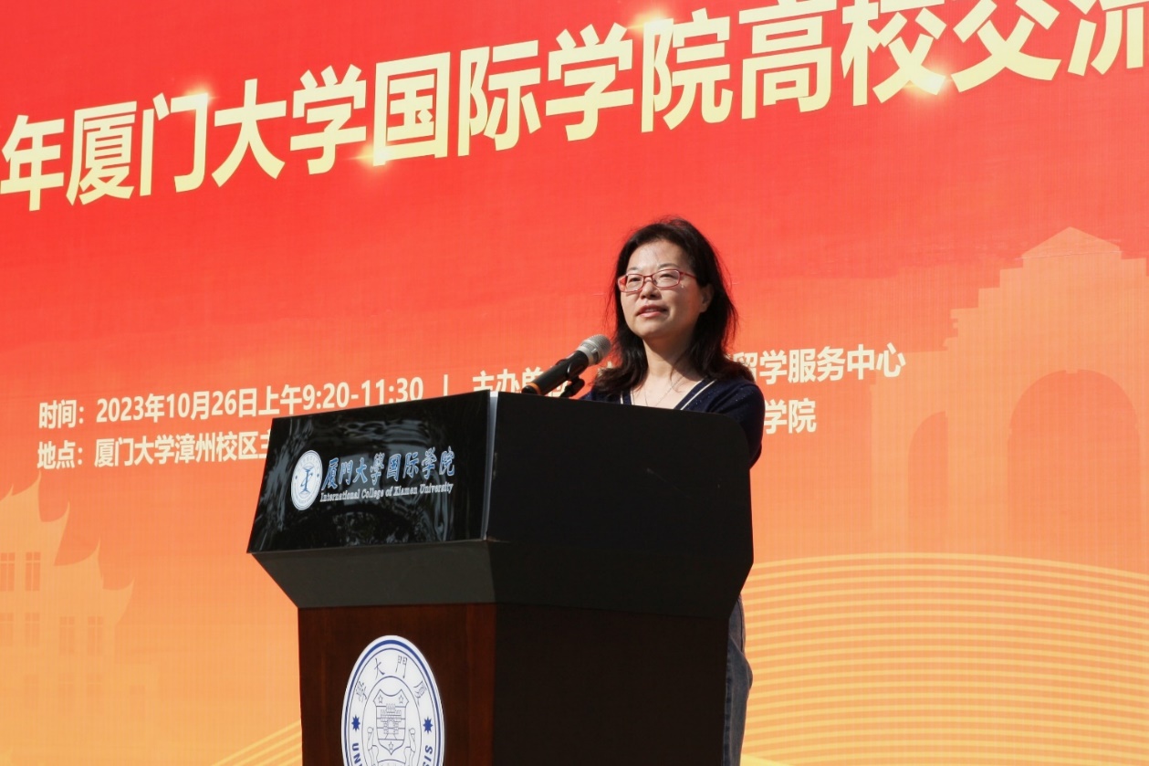 Ms. Zhang Haixia, head of the working team of CSCSE of the Ministry of Education of China and general manager of Beijing Yinhong International Education Consulting Co., LTD., delivered a speech. She introduced the running of the British Higher Education Diploma program and pointed out that after 20 years of development, the program has achieved remarkable results. As a brand activity of the program, the university Exchange meeting has built a platform for students to communicate with foreign universities. She thanked International College of Xiamen University for its careful organization and the active participation of its foreign partner universities. She hoped that the students would take the opportunity of "home delivery service" and gain something from the university exchange meeting. She hopes that the students, as China's folk ambassadors, will tell the world a good story of China, spread the voice of China, carry forward the tradition of studying abroad and serving the country, and write a chapter of life in the process of studying in the world and realizing their dreams.