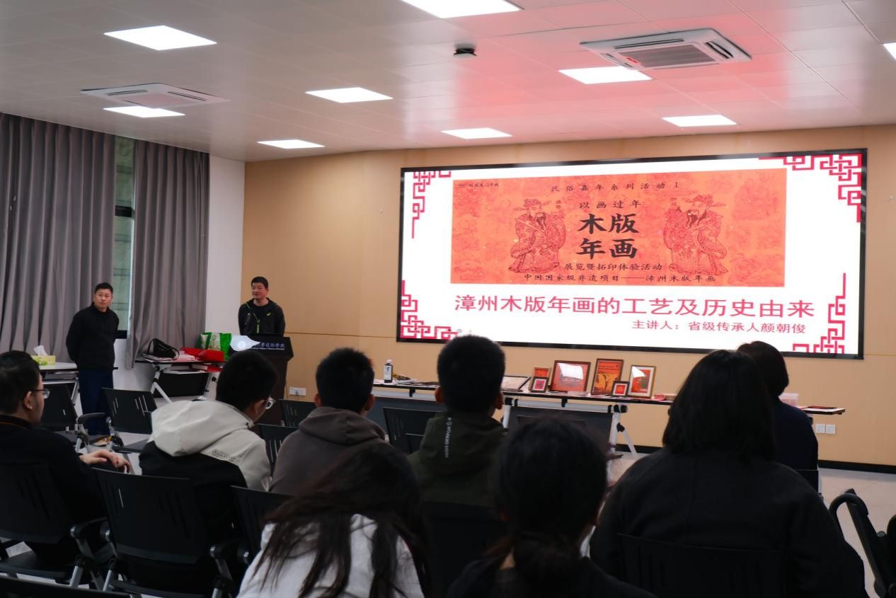 Mr. Yan began by playing a documentary on Zhangzhou Woodblock New Year Painting for the students. The rustic imagery of the New Year paintings and the vivid stories of skill inheritance instantly immersed everyone in the world of this intangible cultural heritage. Zhangzhou Woodblock New Year Painting distinguishes itself from other regional styles across China through its unique douban technique, which involves printing colors first and outlines later. It stands as one of China's ancient surviving forms of color printing, with its foundational woodblock carving and printing techniques traceable back to the Song Dynasty, reaching full maturity by the late Ming Dynasty. In 2006, Zhangzhou Woodblock New Year Painting was included in the first batch of national intangible cultural heritage items announced by the State Council, and was known as one of the four major folk woodblock New Year pictures in China along with "Tianjin Yangliuqing", "Jiangsu Taohuawu" and "Sichuan Mianzhu" woodblock New Year pictures.