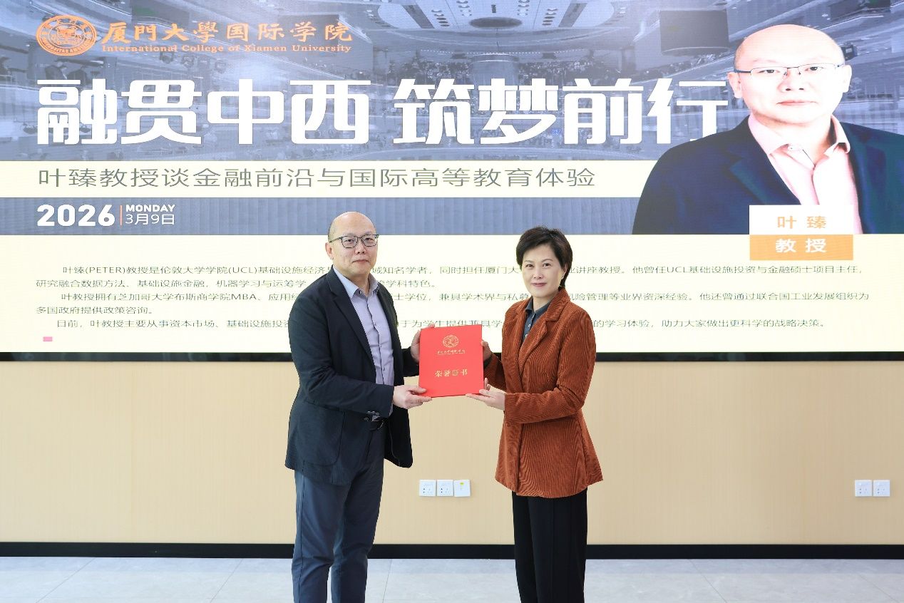 On the afternoon of March 9, the first lecture of the International College’s series East-West Integration, Dream Construction was held in the Multi-Function Room 101, Main Building No. 4, Zhangzhou Campus. Professor Ye Zhen (Peter), a distinguished scholar from University College London (UCL) and an alumnus of Xiamen University(XMU), was invited to deliver the lecture. He engaged in an in-depth dialogue with teachers and students of the college on the cutting‑edge developments in finance and international higher education experiences. The lecture was chaired by Yu Hongbo, Dean of International College(IC), XMU, attended by faculty and student representatives of the college.