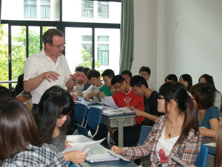 Erik Empson does a lecture on British history first. the students lecture seriously and take notes. Next, Erik Empson the class into five groups, panel discussions with British business newspaper, periodicals and other materials. After the preparation phase, each group of students to express their opinions materials to Erik Empson. He gives feedback to students ‘opinions.
