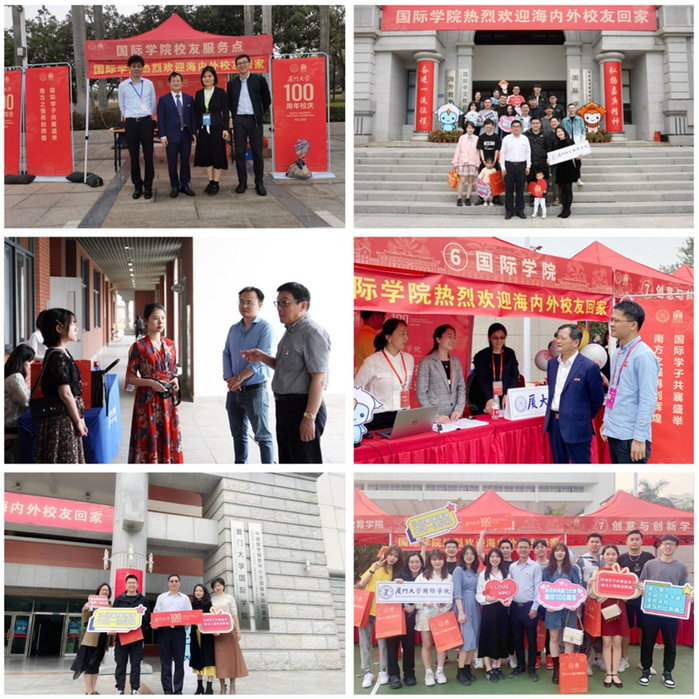 From April 3rd to 6th, Siming, Xiang'an and Zhangzhou, three campuses respectively set up a centralized reception place for the International College alumni. Each reception booth was carefully decorated, warm and festive.  “Xiaobai” and “Xiaoxia”, two centenary celebration mascots and the welcome messages reflect each other, and 558 alumni were welcomed home successively. The leaders of the college greeted the arrival of the alumni at each reception desk, had cordial exchanges with the alumni, asked them about their current situation, expressed gratitude and congratulations on their outstanding achievements, and wished them a better future. The administrative team and student volunteers work together to carefully check and register the alumni information, distribute centenary celebration cultural souvenirs, enthusiastically guide alumni to participate in school celebration activities, and provide alumni with real-time online consultation services, so that every alumnus returning to Xiamen University can feel the warmth of family.