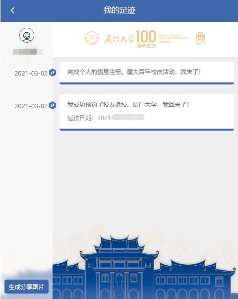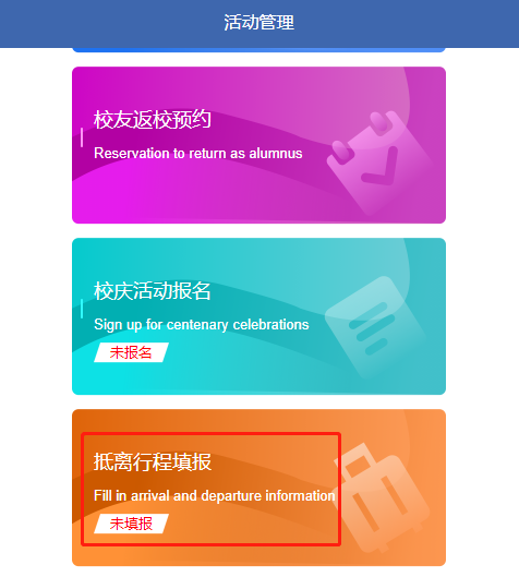 During the centenary celebration, the alumni can reserve through the Centenary Celebration Meeting System, which includes two ways, the “self-return reservation” and “college activity reservation”. The result will be sent to the registered phone or email, and also you can log into the system to check it. And after the reservation is approved, the school will open the access authority according to the reserved information. Please show your original ID when entering school.