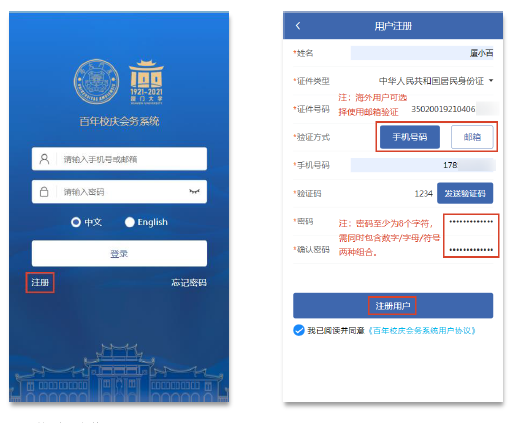 Click “register” in the lower left corner to register an account. Registration can be verified by mobile phone or email, and mobile phone is recommended. Please fill the accurate information, such as, name, ID type, ID number, mobile phone number, and email address.