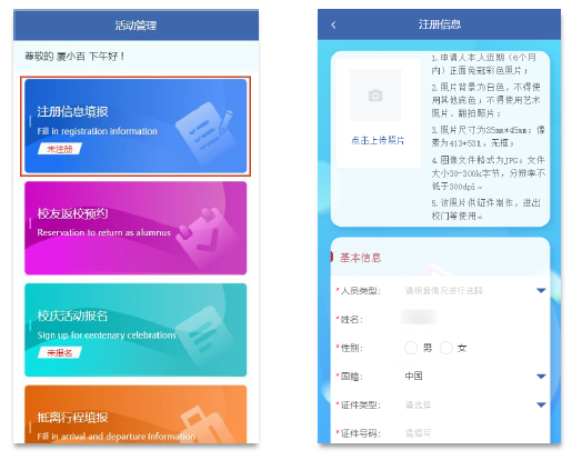 After logging in, please fill your information first. The registration result will be sent to the registered mobile phone(email), and you can also log into the system to check.The photos uploaded by the system are mainly used for face recognition and certificate making, and all alumni need to upload them. For the personnel type, please select return as alumnus.
