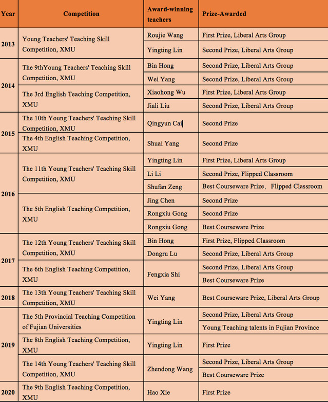 The Xiamen University Teaching Competition is jointly organized by the Teacher Development Center, the University Trade Union, the Academic Affairs Office, the Teacher Work Department, and the Personnel Office, which is an important platform for testing the teaching level of young teachers and cultivating the strength of the new generation. In recent years, our school has sent many outstanding young teachers to participate in the competition, all of which have achieved good results. Statistics on teachers’ awards from the International College in recent years: