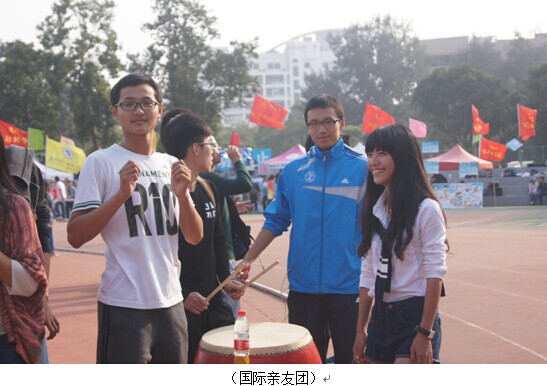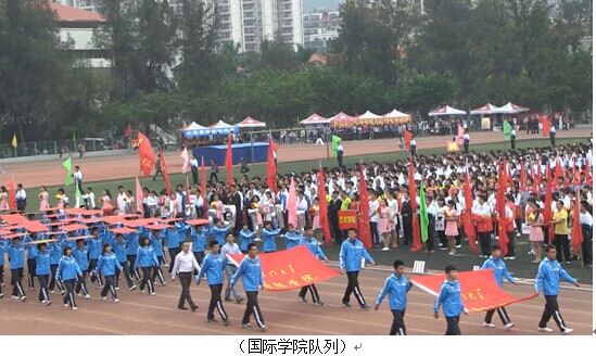 At 8:00am, the students of the International College were dressed in blue sportswear, marching steadily on the track and shouting loud slogans,"Overseas International, Handsome or not; come on baby, do not be shy". The loud slogans were humorous and positive, which show a vigorous and youthful college.