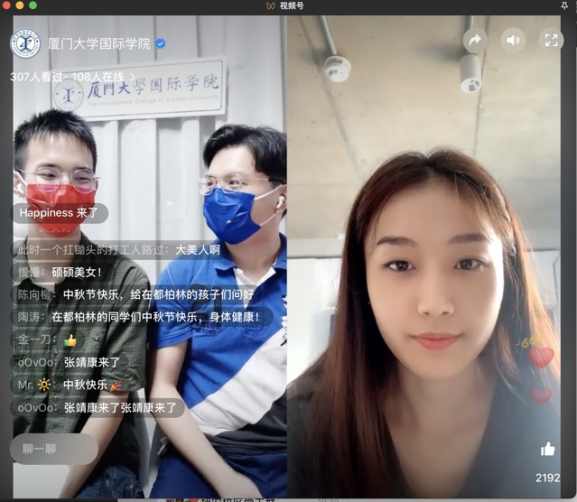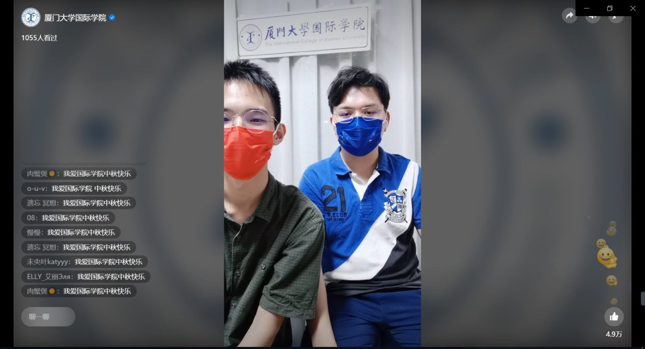 Due to the impact of the COVID-19 epidemic, the Mid-Autumn Festival related celebrations couldn’t be held on campus. In order to let students feel a strong festive atmosphere and ease the anxiety during the epidemic, International College of Xiamen University, innovated form and held a live broadcast of the Mid-Autumn Festival "Cloud Gala" through the Wechat video account “ International College of Xiamen University”. The event not only brought wonderful online programs to the students, but also integrated the traditional Mid-Autumn Festival culture into it, allowing the students to gain during play, and further promote the excellent traditional Chinese culture, and achieved good effects. The live broadcast room received more than 1000 viewers, a total of 1206 interactions, and 51,000 likes.