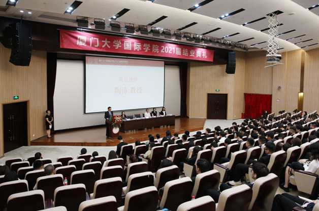 The graduation ceremony began with the majestic national anthem. Professor Tao Tao, Dean of International College, on behalf of the college delivered a speech, he sent the warmest congratulations and best wishes to the students who successfully completed the 2021 class, and expressed high respect and heartfelt thanks to all the faculty, staff, and parents of the students. He briefly reviewed the history of Xiamen University’s 100-year development, and pointed out that under the leadership of the Communist Party of China, Xiamen University has achieved rapid development. Not only has it achieved the goal of becoming a strong school in the South, it is also making strides to become a world-class university. The students finished their study in 2021 have the honor to witness not only the centenary of Xiamen University, but also the upcoming centenary of the founding of the Communist Party of China. So, this year’s ceremony has extraordinary significance. He put forward three expectations for the students: Firstly, I hope all the students will always be enterprising, adhering to the school motto of “Pursue Excellence, Strive for Perfection”, and regard learning as a quality of pursuing excellence and be a good learner. Secondly, I hope that all the students will always maintain a broad vision and inclusive attitude. In the future life of studying abroad, learn multi-culture with open mind, maintain full culture confidence, and show a good national image. Thirdly, I hope that all the students will always be kind and grateful, to help those in need and to inherit the great love spirit of Xiamen University, “knowing without center, loving without bound”