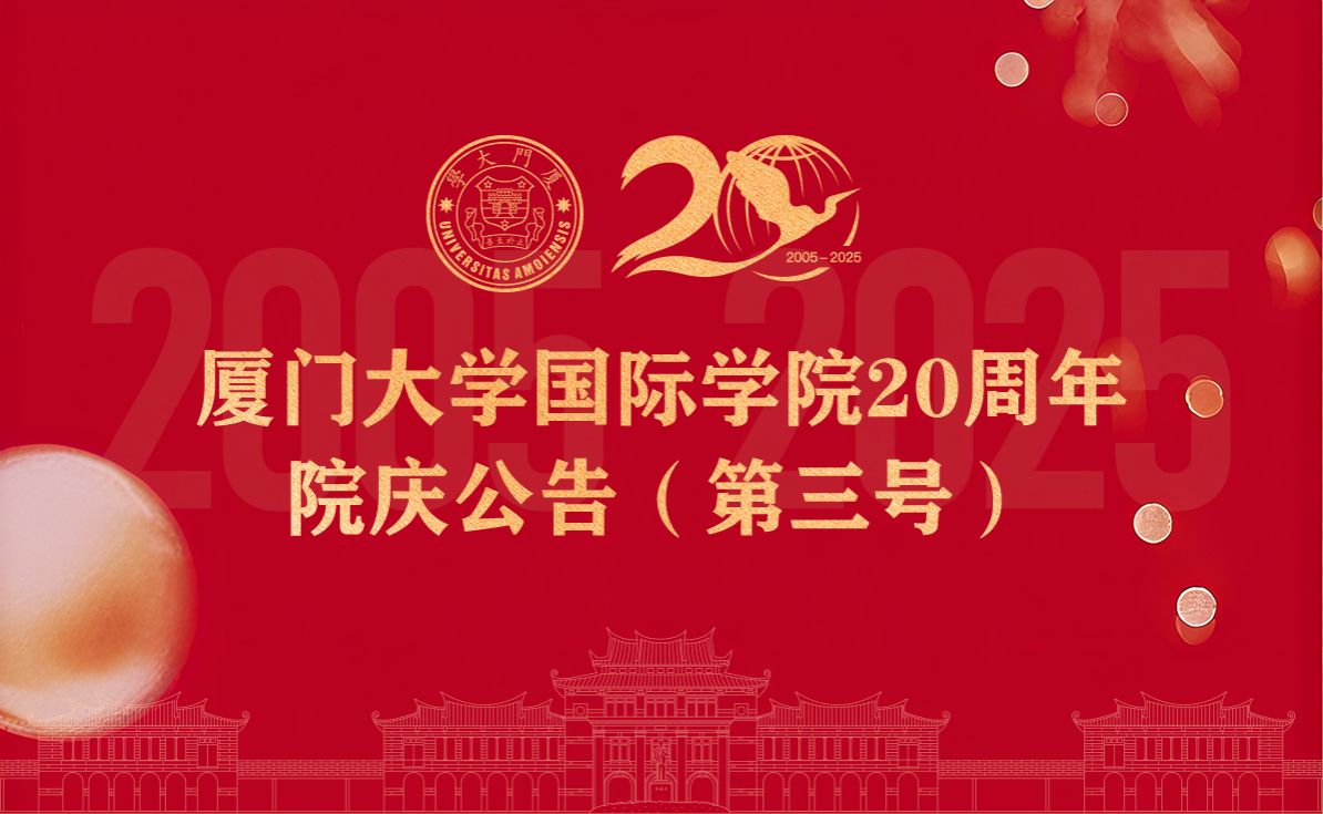 两秩芳华,弦歌不辍。自二十周年院庆一号、二号公告发布以来,全院师生员工、海内外校友和社会各界热切关注,鼎力支持,在此谨致衷心感谢和崇高敬意!盛会将至,华章待启。现将主要活动日程公布如下:佳期渐近,翘首以盼。我们诚邀广大校友和各界宾朋拨冗莅临,相聚厦园,共襄盛举!特此公告,敬祈周知。厦门大学国际学院2025年10月8日校友、宾朋预约参加活动二维码: