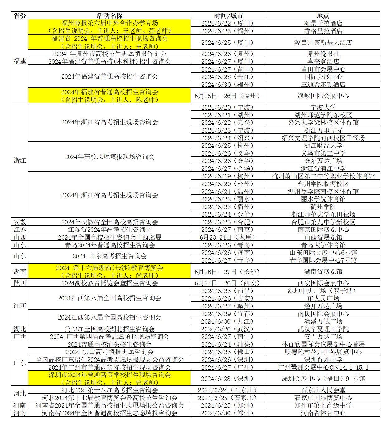 2024年6月现场高招咨询会时间安排