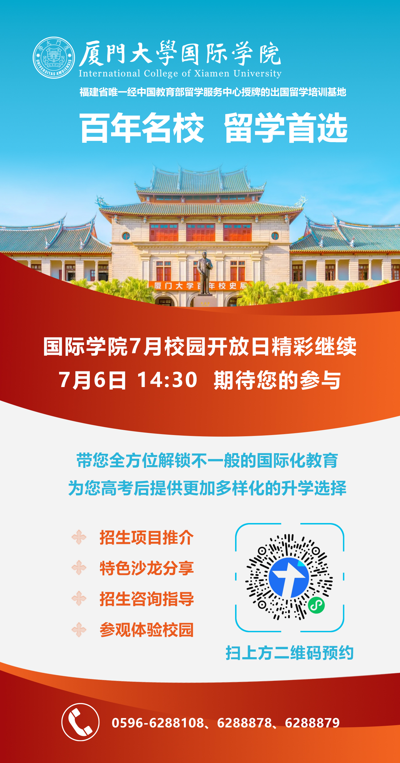 厦门大学国际学院7月校园开放日,重磅嘉宾汇聚一堂,只为带你全方位解锁不一般的国际化教育,全力助力学子成就出国留学梦想!校园开放日活动现已开放预约!请扫描下方二维码进入预约页面,填写表单信息后提交预约申请,招生老师将尽快与您联系。
