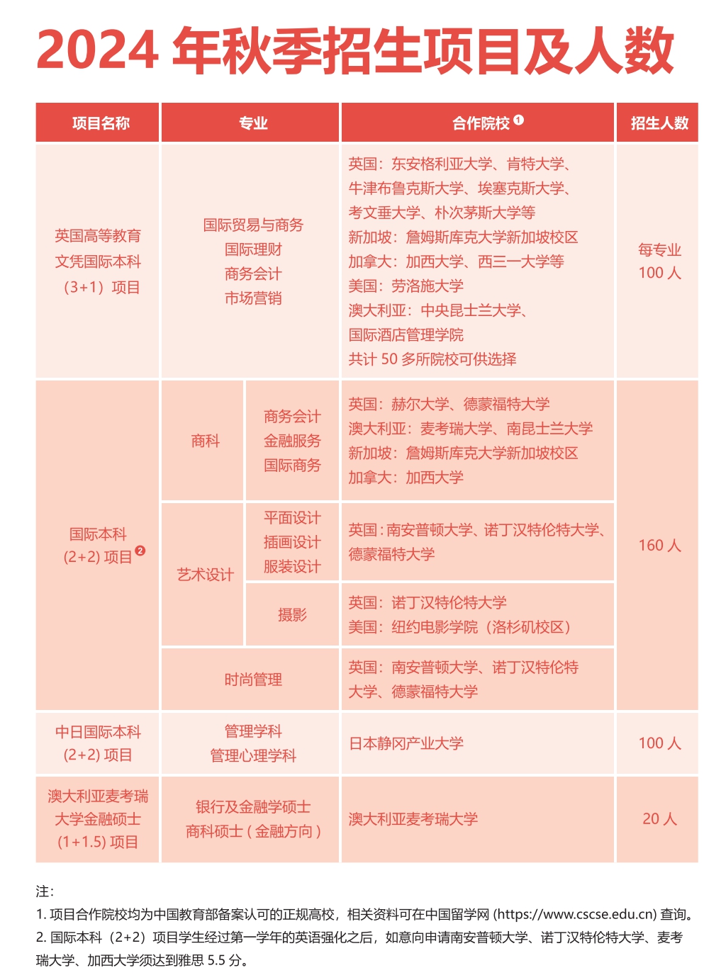厦门大学国际学院与英国、美国、澳大利亚、新加坡、日本等多个国家的多所知名大学合作3+1、2+2等多类型留学项目,设有国际理财、商务会计、艺术设计、时尚管理等热门专业,为学生提供丰富的留学选择。