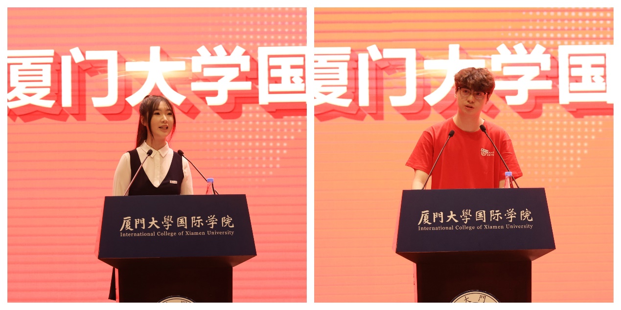 2023级学生张珈予和2024级新生卢文豪分别作为在校生代表和新生代表发言。张珈予结合在校学习生活经历及感受,勉励同学们尽快适应新环境,以最饱满的精神面貌迎接大学生活,明确学习目标,制定清晰的学业规划,积极参加各项活动,珍惜每一个锻炼和提升自己的机会。卢文豪代表全体新生表示,厦大是新国际学子们人生的新驿站、新起点、新篇章,他们将在嘉庚精神、厦大校训的指引下,脚踏实地、刻苦钻研,奋力书写属于自己的青春华章。