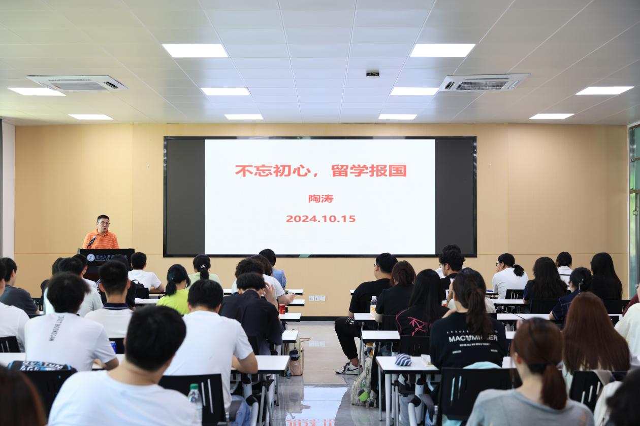 为深入推进文明社区建设,引导学生面向未来海外求学生活,养成良好的生活习惯,涵养文明行为,培养热爱劳动、尊重劳动的意识,提升自主生活能力,从留学归国的优秀前辈和师长身上汲取经验,进一步明确留学深造的方向和意义,学院举办策划了“我的留学生活”系列茶话会沙龙。10月15日,首场讲座在漳州校区4号楼101会议室举办,由院长陶涛教授与同学们进行分享交流。讲座由学院党委副书记马向华主持。