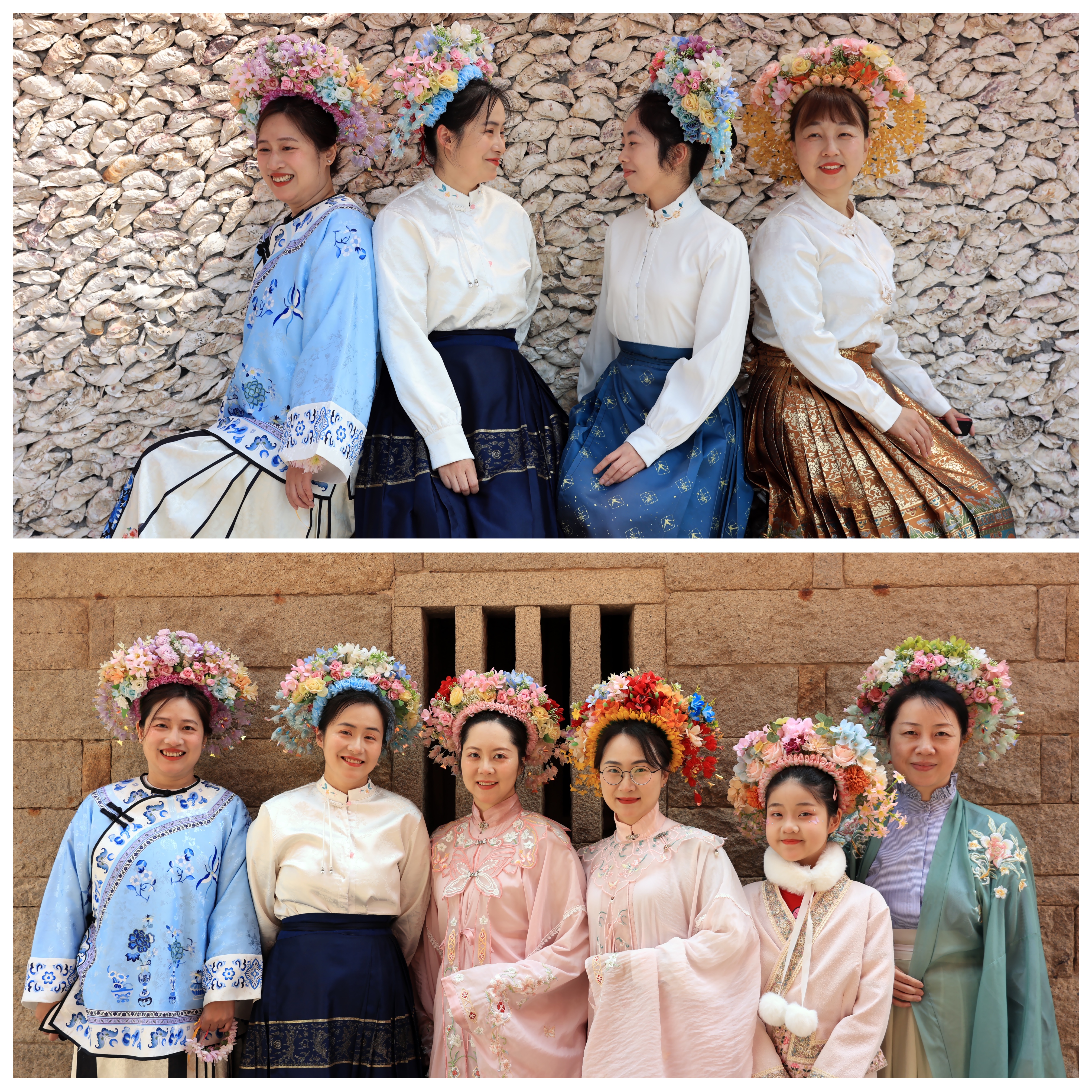海风送暖入渔家,四季花开映蟳埔。通过近两小时的车程,老师们首先抵达蟳埔民俗文化村。这里曾是古闽越族的聚居地之一,以其独特的海蛎壳修筑的蚵壳厝和蟳埔女的头饰而闻名。在讲解员的带领下,老师们参观了保存完好的蚵壳厝,感受闽南沿海古民居建筑的巧妙与精湛,并亲身体验了“簪花围”这一传统头饰文化。大家戴上色彩斑斓的簪花,化身蟳埔女,充分展示传统文化的独特魅力。