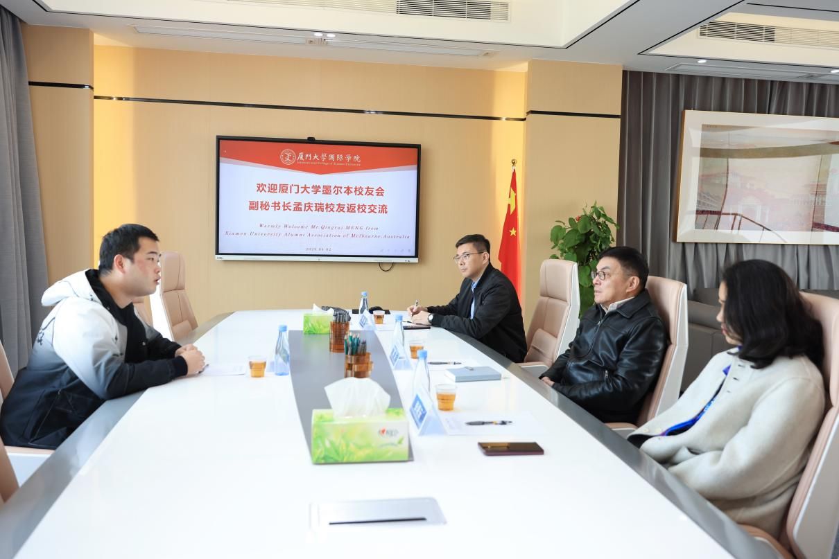 近日,国际学院2013级校友、厦门大学墨尔本校友会副秘书长孟庆瑞返校交流。国际学院院长陶涛、副院长张晓云及校友工作人员参加座谈。