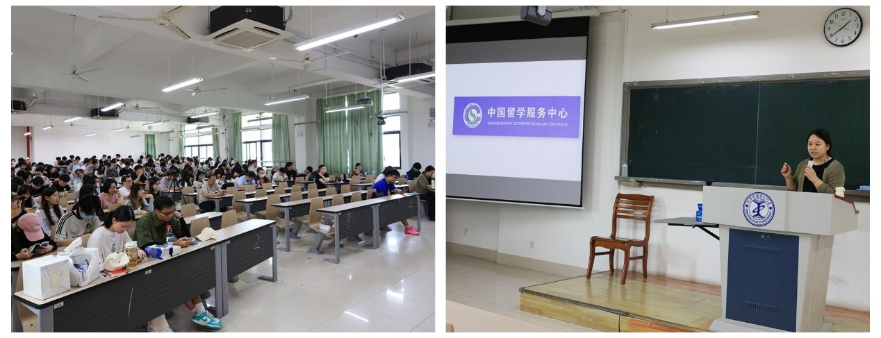 随后,中国(教育部)留学服务中心留学工作组老师于 511 教室为同学们开设出国留学行前指导讲座,围绕留学手续办理、行前准备等内容展开详细讲解,并针对签证办理、入境注册、硕士申请等学生关切点进行重点指导。