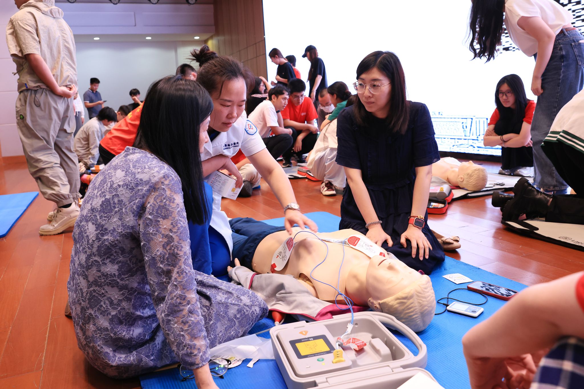 理论讲解结束后,同学们纷纷上台进行实操训练。培训现场准备了充足的人体模型和急救设备,同学们分组进行练习,亲身体验急救操作流程。厦门大学翔安医院的医护人员在一旁耐心指导每一个急救动作,从判断患者意识、检查呼吸,到进行胸外按压、开放气道和人工呼吸,每一个步骤都讲解得细致入微。