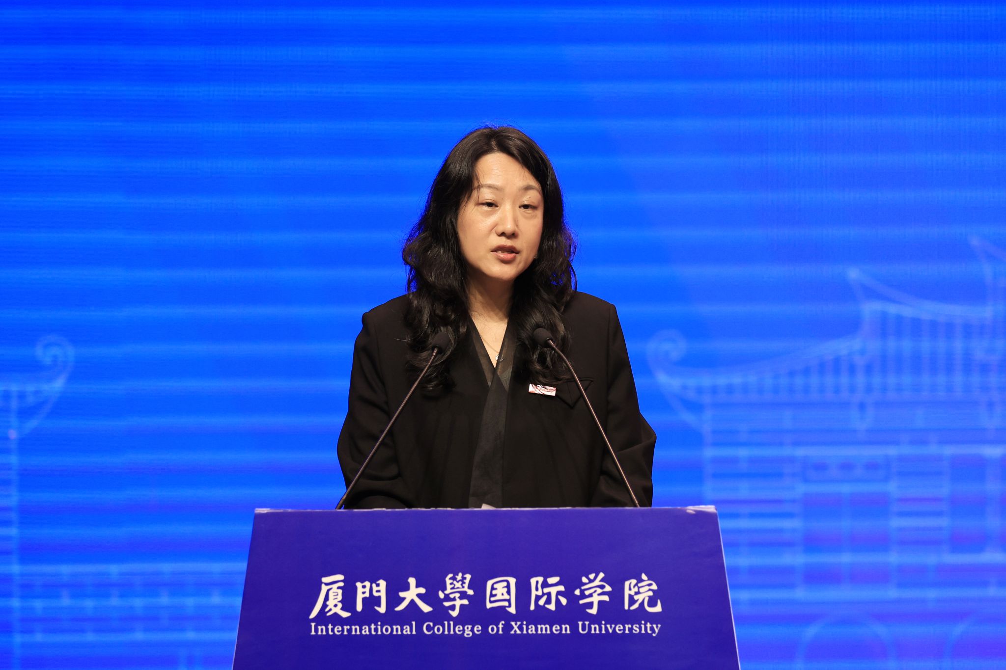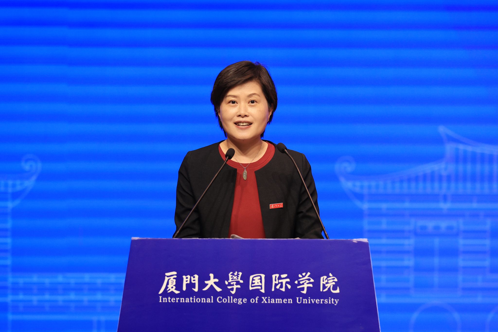 在雄壮的国歌声中,典礼正式开始。院长余宏波代表学院致辞,她首先向全体顺利完成学业、即将踏上新征程的同学们表示热烈的祝贺,对辛勤付出的学院全体教职工和学生家长亲友们致以衷心的感谢和诚挚的敬意。她高度肯定了同学们在学业及各类竞赛中取得的优异成绩。今年11月,学院将迎来20周年华诞,廿载桃李,薪火相传,值此之际,余宏波院长向同学们提出三点期许:一是希望同学们坚守本心,行稳致远。始终牢记厦门大学“自强不息、止于至善”的校训,坚定心中理想信念,于细微处做起,培养高尚的人格;二是希望同学们永葆进取之心,学无止境。始终保持好奇心,紧跟时代发展,提升融通创新能力,持续拓展认知边界,在技术变革的浪潮中从容自信;三是希望同学们始终保持开阔的视野,包容的心态。在今后的留学生活中,以开阔的胸襟学习多元文化,以全球视野认识、思考国家和世界发展,同时保持充分的文化自信,展示良好的国家形象,带着中华民族博大精深的优秀文化走向世界。