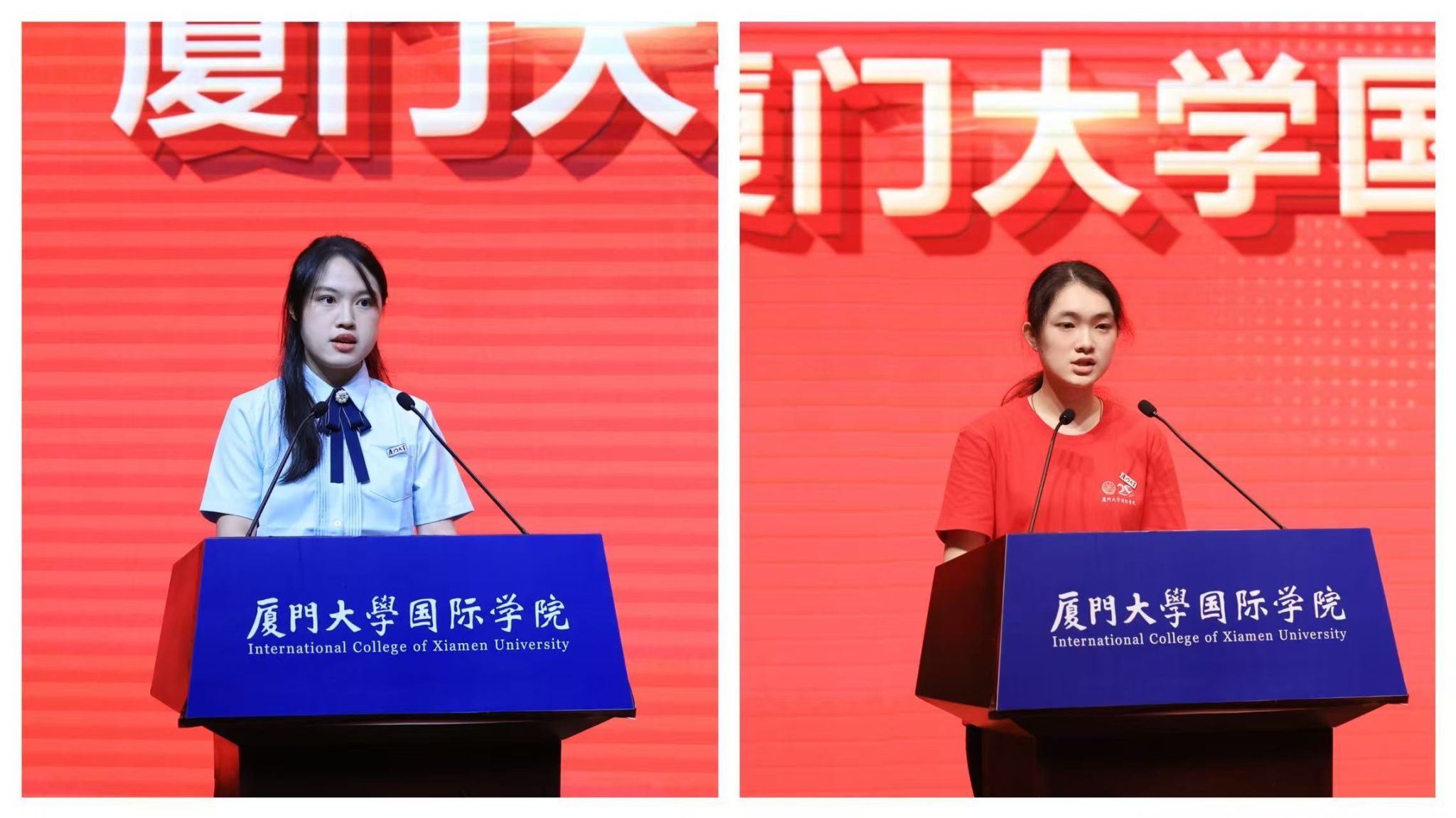2024级学生罗海菁和2025级新生陈怡分别作为在校生代表和新生代表发言。罗海菁结合雅思学习和参与剑桥交流项目等在校学习生活经历,鼓励学弟学妹们认识自我、做好规划,积极参与实践活动,充分利用学院提供的国际化平台,勇敢探索、书写属于自己的精彩篇章。陈怡代表全体新生表示,他们将秉持“自强不息,止于至善”的校训,从课堂学习、语言磨炼与文化交流实践中积蓄力量,以融通中外、守正创新的姿态,在未来国际舞台上讲好中国故事,向世界展现中国青年的智慧与担当。