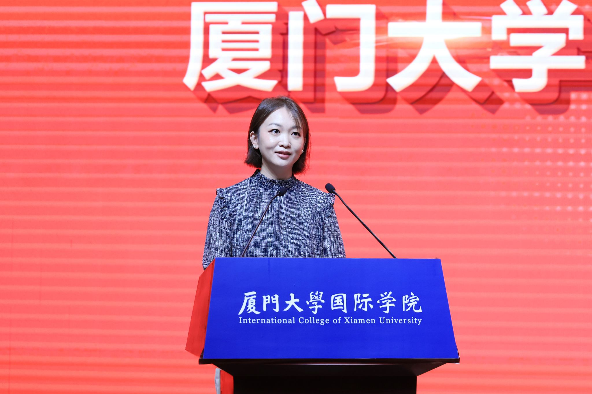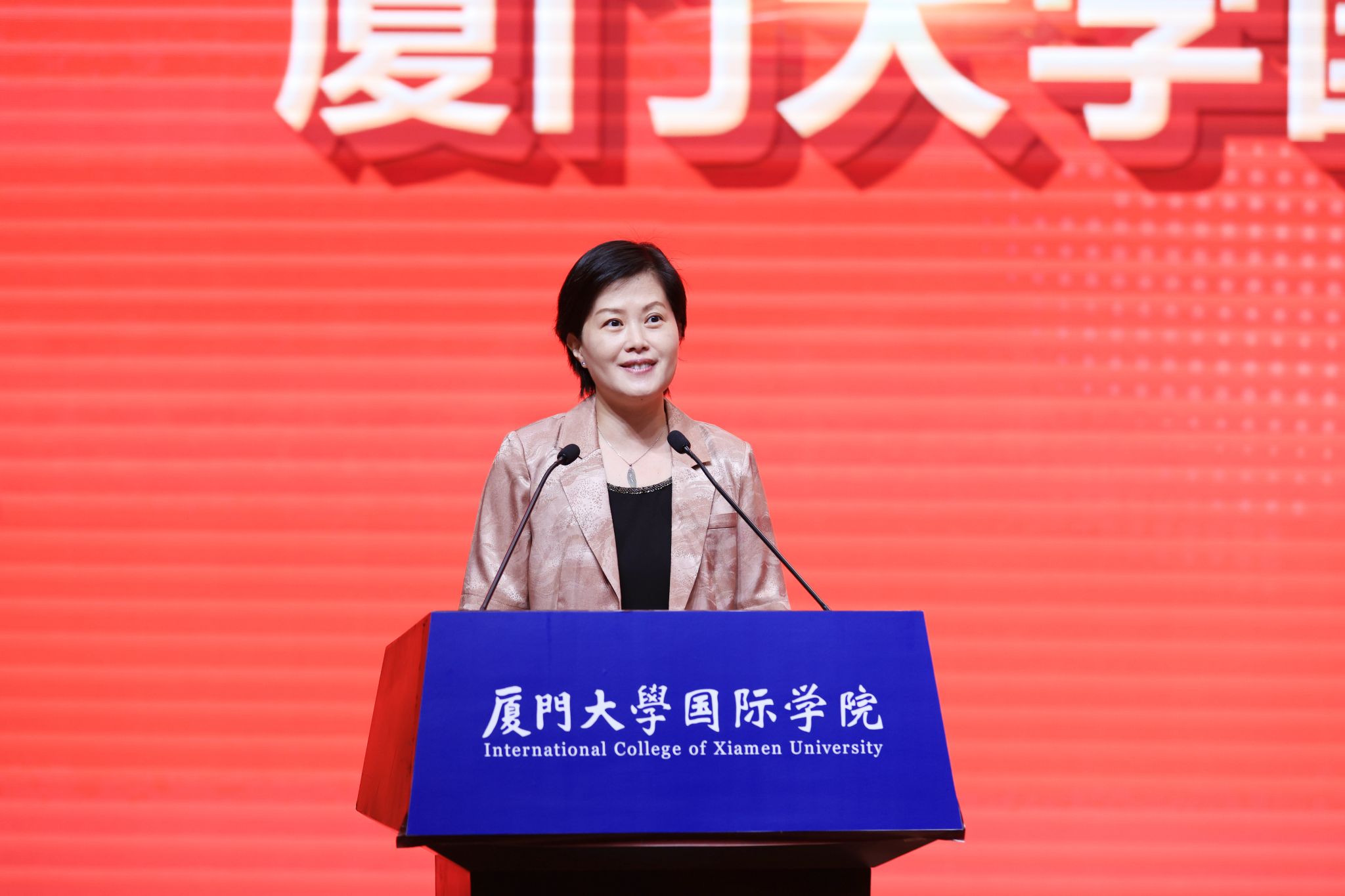典礼在雄壮的国歌声中拉开帷幕。院长余宏波代表学院致辞,她首先为2025级新生送上衷心的祝贺和热烈的欢迎,向给予学院支持和信任的学生家长们表示崇高的敬意和衷心的感谢。她简要回顾了厦门大学的办学历程,结合学院发展及人才培养成果,向同学们提出四点希望:一是希望同学们能牢记厦大人的初心使命,将个人成长与国家发展相结合,努力成为堪当民族复兴重任的时代新人;二是在即将迎来建院20周年之际,希望同学们能坚持勤勉自律,练就过硬的本领,以优秀校友为榜样,尽快适应大学学习生活,刻苦钻研,为未来出国深造和报效祖国做好准备;三是希望同学们能抓住出国(境)学习交流的机会,培养全球视野,建立勇担使命的世界格局,锻炼跨文化沟通和国际交往能力,掌握和运用好AI等各项新技术,成为复合型的国际化人才;四是希望同学们坚持体育锻炼,利用优美的校园环境和完善的运动设施,保持或养成爱运动的习惯,强健体魄,全面发展。