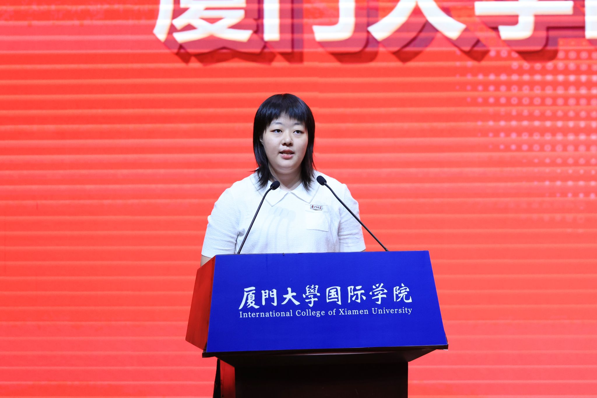 郭然老师作为教师代表发言。她结合日常课程教学及实践活动等向新生们展示了学院的国际化办学理念,期望同学们在未来学习中能从“被动接受”转向“主动探索”,敢于辩证思考,构建自身知识体系,同时注重团队协作,培养坚韧品格,将个人发展融入时代洪流,书写独一无二的青春篇章。