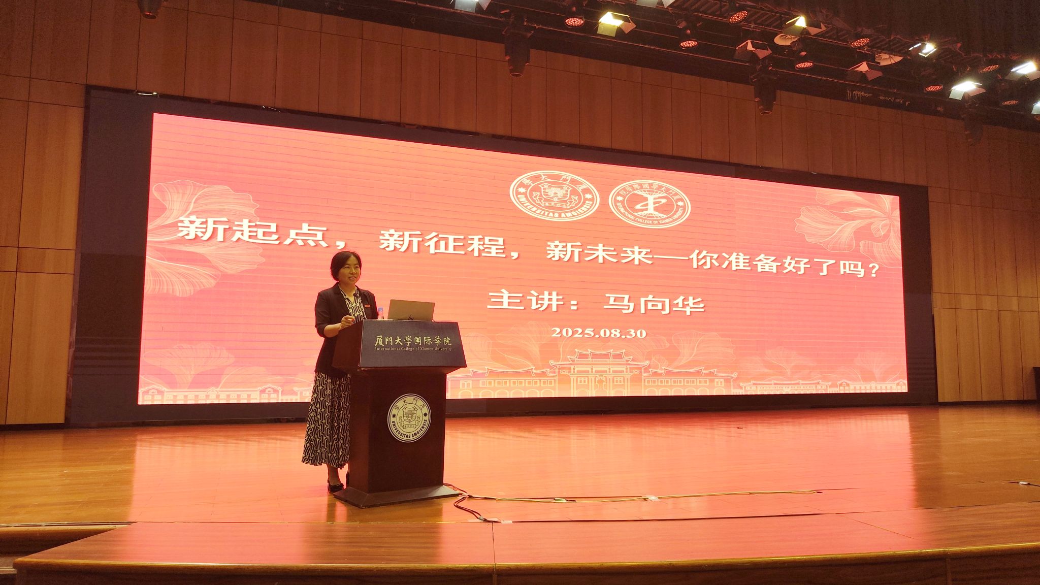 8月30日下午,学院党委副书记马向华以“新起点,新征程,新未来——你准备好了吗?”为题开展入学教育第一讲。她向新生们介绍了厦大漳州校区概况、国际学院发展及学生管理理念。解读了嘉庚精神和厦门大学的校园文化,展示了学院为学生搭建的多元成长平台和国际化育人环境。指导和鼓励同学们主动规划学业生涯,用心积累生活智慧,积极参与校园活动,完善自我、着眼未来,将个人命运与国家发展联结起来,做有理想、敢担当、善作为的时代青年。随后辅导员苏德详细讲解了法律法规、校规校纪和住宿管理规定,引导同学们树立文明行为意识,为校园生活奠定规范基础。