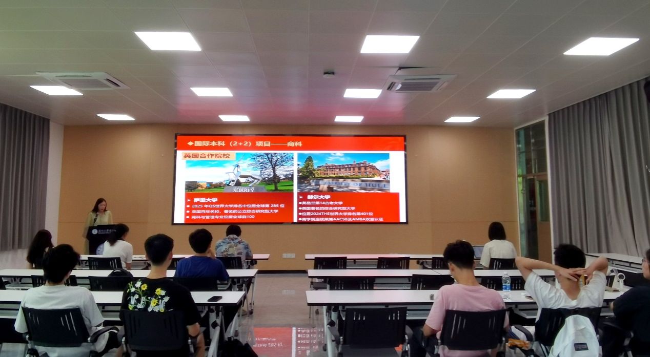 当日下午,学院还为国际本科2+2项目商科方向学生开展了有针对性的留学指导及院校宣讲,进一步满足不同项目学生的需求。学院留学指导老师反复强调“早规划、早准备”的重要性,提醒同学们紧扣留学时间线与关键申请节点,制定清晰的学习计划,利用本学期时间全力提升语言成绩与专业GPA,同时注重强化个人综合素养,为2026年顺利出国深造及未来职业发展夯实基础。