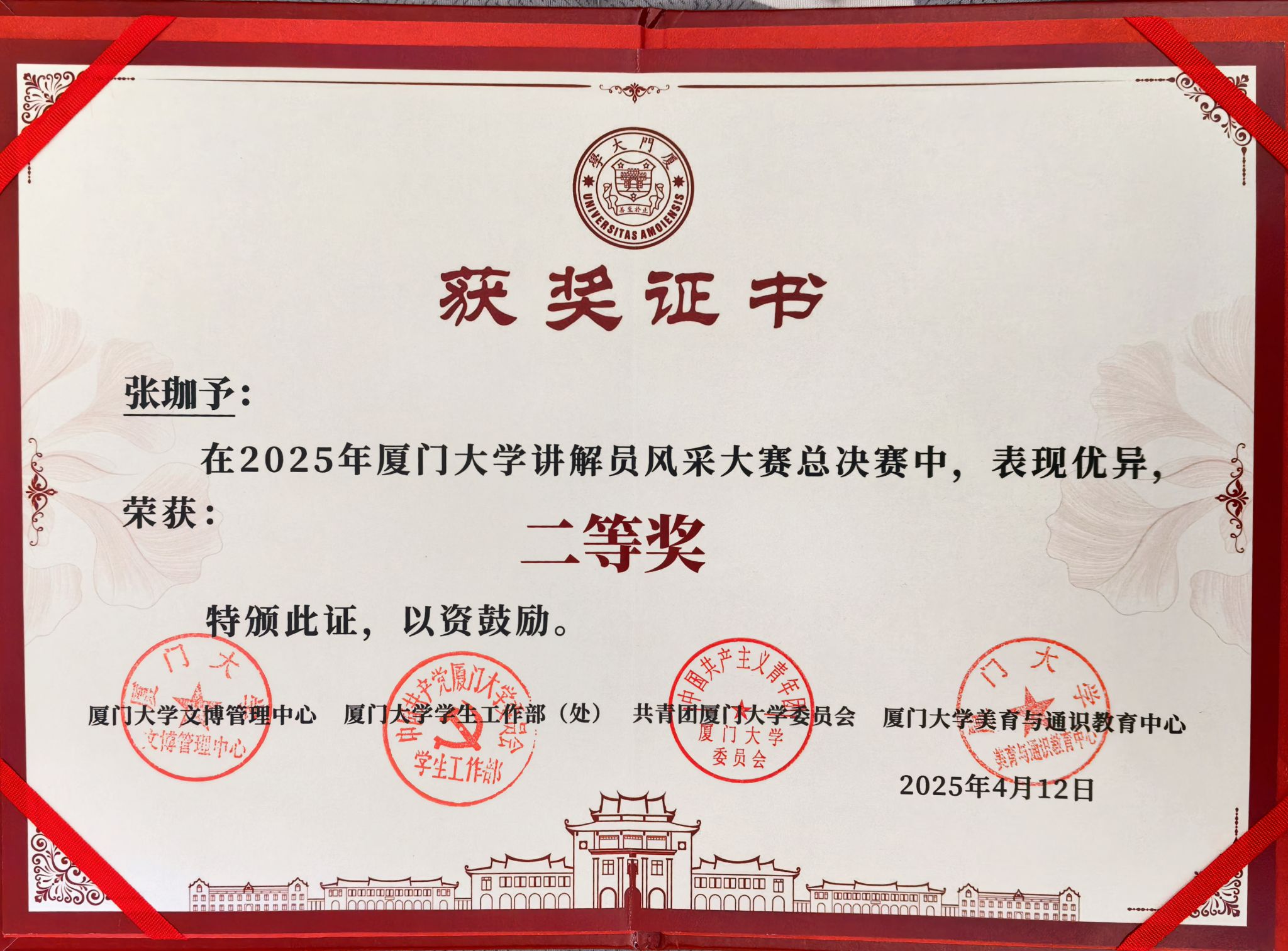 在厦门大学“传颂传承传播——讲好厦大故事”讲解员风采大赛中荣获二等奖(第四名),通过生动讲解传递厦大精神,讲好厦大故事;