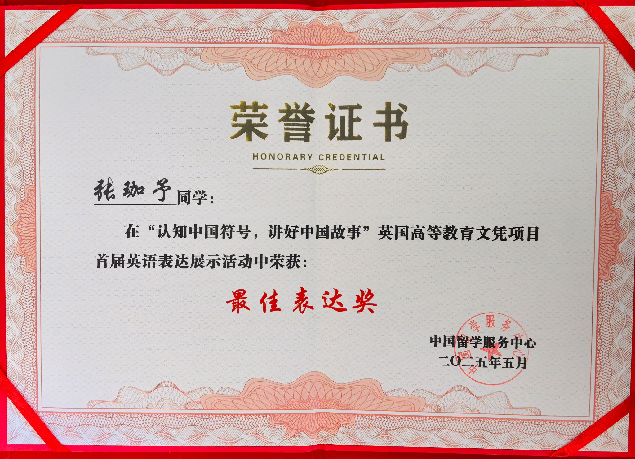 在“认知中国符号,讲好中国故事”英国高等教育文凭项目首届英语表达展示活动中,以总分第一的成绩斩获“最佳表达奖”,用流利的英语向世界展现中国文化魅力。