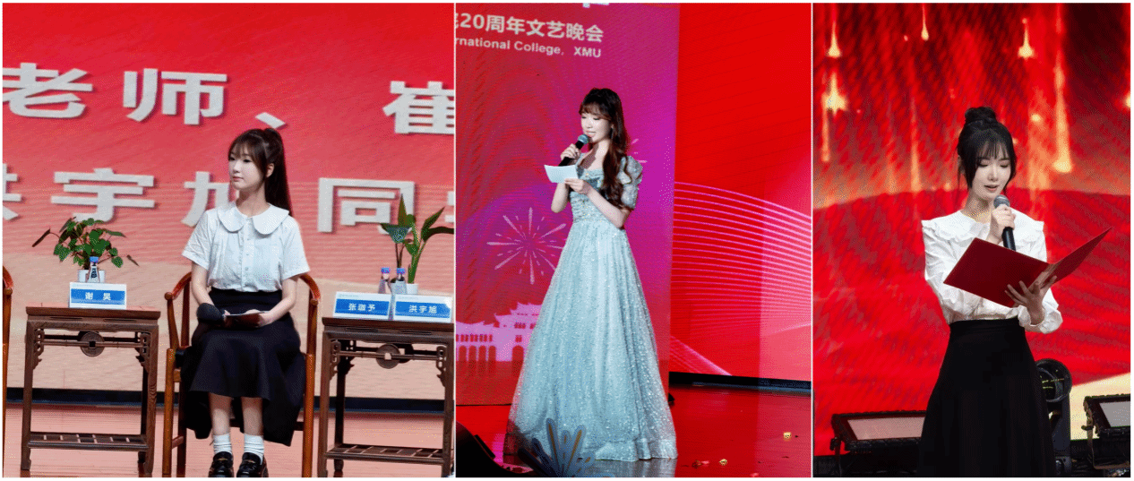 作为班长、团支部书记、文娱部轮值部长,我始终秉持服务同学的初心,高效统筹各项事务:协助老师完成团员管理、班级建设等工作,搭建起师生沟通的坚实桥梁;参与学院组织的各项活动,主持学院建院20周年文艺晚会、“嘉庚精神耀南强、留学报国新起航”文艺晚会、校友分享会等十余场活动,以沉稳大气的台风、流畅专业的控场能力,为校园活动增添亮色。