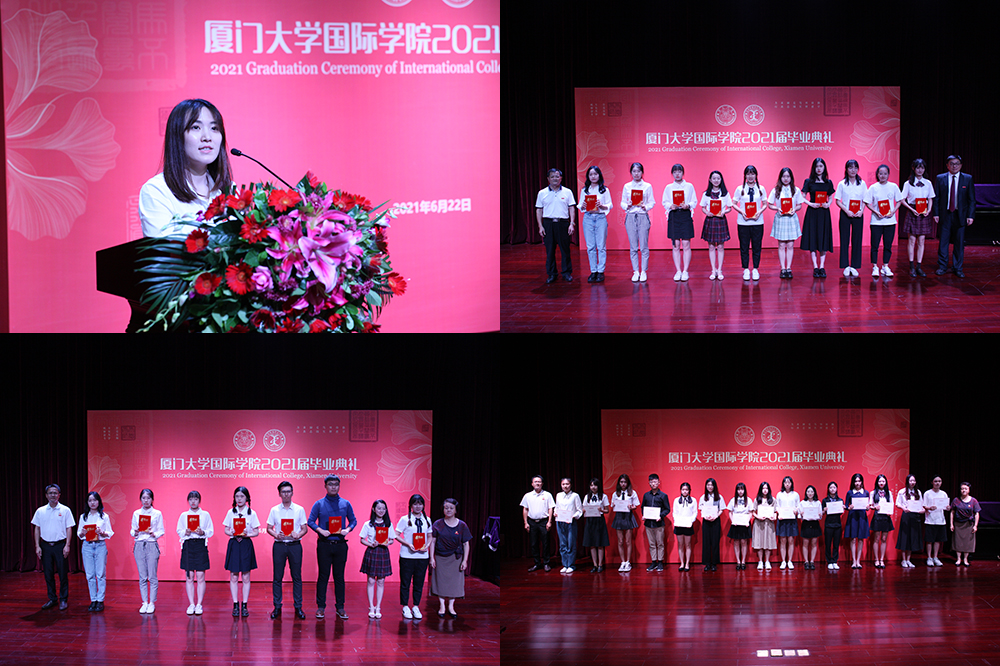 本届毕业生中有不少同学获得了国家奖学金和厦门大学各类荣誉称号,还有许多同学在国内外竞赛中取得了优异的成绩。在颁奖环节,学院对获得“雅思高分奖”、厦门大学“三好学生”“优秀学生干部”“优秀毕业生”等荣誉称号的学生进行表彰。学院领导为获奖的学生代表颁发荣誉证书,并合影留念。典礼在庄严的校歌声中圆满落幕。