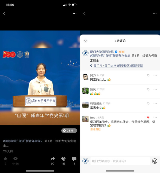 为庆祝中国共产党成立100周年,厦门大学国际学院于4月1日起推出“自强”新青年学党史系列微党课,引导青年学生分组收集党史材料,走上讲台讲授红色故事,打造精品党史微视频。在备课、讲解、剪辑的过程中,党史知识悄然沁入心田,朋辈的精彩微党课,有效地激发了同学们的学习热情。目前,学院已推出7期微党课,以生动鲜活的小故事在全院广大学生中掀起党史学习教育热潮,持续推进党史学习教育深入人心,变“要我学”为“我要学”、“我爱学”。