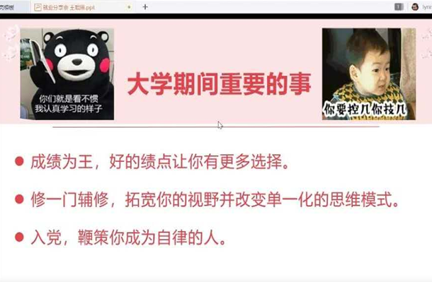 首先进行分享的是已获得中建海峡建设发展有限公司录用offer的2016级会计专业王琨琳同学。她以诙谐幽默的熊本熊头像出现在直播间,文字写着“你们就是看不惯我认真学习的样子”,一个努力好学又十足幽默的王同学,开始了以“认识自己,塑造个体”为主题的经验分享。