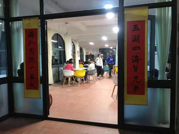 中华文化体验室的装点也在同步进行,“五湖四海皆兄弟,海外国际一家亲”这幅挂在正门口的黄底红色毛笔字大对联,热烈欢迎每一位参与“汉语角”的海内外同学。