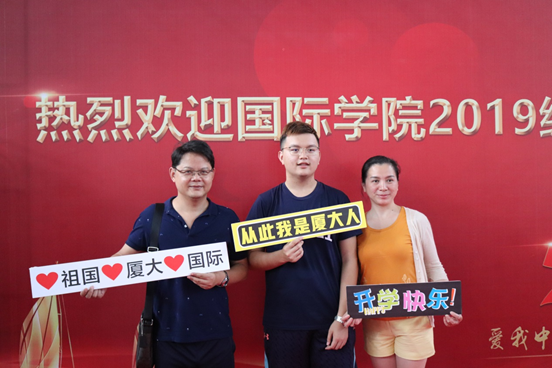 报到注册时,新生们不仅领到了自己的学生证、学生卡以及校徽,宿舍钥匙,还有各类新生入学材料。报到现场设置的新生留言墙和写有“♥祖国♥厦大♥国际”、“从此我是厦大人”、“开学快乐”等内容的拍摄道具同样吸引新生和新生家长积极参与其中。不少新生家长为学院形式多样、创意丰富的迎新方式点赞。更让新生们暖心的是,每年学院在迎新季都会为新生们准备餐券。开学的第一天,2019级的新生们就可以陪着家长们一同体验厦大食堂,家的味道。