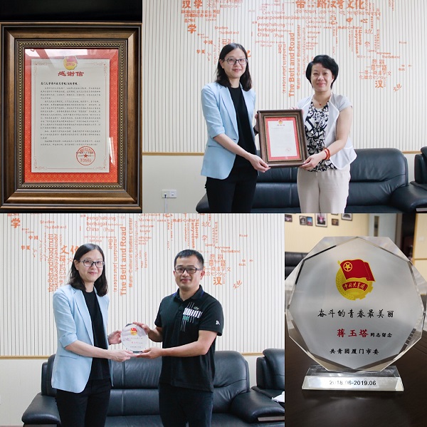 黄芳代表团市委对学院选派蒋玉塔到团市委挂职表示感谢,团市委给学院送来感谢信,对蒋玉塔同志在团市委挂职学少部部长助理期间主动担当、迎难而上、任劳任怨的出色表现和工作中体现出的认真细致、踏实肯干、善于钻研、勇于创新以及较强的组织协调能力、策划执行能力表示充分肯定。蒋玉塔同志还接受了团市委为他本人专门定制的“奋斗的青春最美丽”的水晶纪念牌,黄芳副书记希望今后学院能一如既往地关心支持厦门共青团的工作。