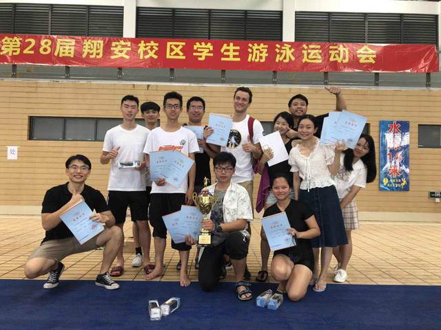 最后一项8*50米自由泳接力,也是竞争最为激烈的项目。来自翔安校区八个学院的代表队展开了激烈的比拼。八支队伍都派出了队内最强选手,各队实力不相上下,战况胶着。最终,我院凭借陈凯文(印度尼西亚)在最后时刻的爆发,成功反超并拿下接力项目冠军,同时也打破了该项目的校纪录。