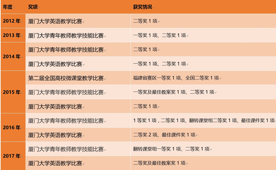 不仅如此,作为我院英语教研组组长,林老师经常组织老师们交流,分享最新的实用的教材资源,很多学生喜欢的教学设计便是在这样的“脑力激荡”中产生的。特别对于我院大一和大二年级的英语分级教学,林老师鼓励同级别授课的老师利用上课时间去解决学生的“共性问题”,课下的每周4小时坐班时间就能针对学生的个体需求进行一对一深入的辅导。通过这些举措更好地因材施教,调动同学的学习积极性。在林老师带领和感染下,全院教师相互交流切磋,营造了良好的教学氛围。近年来,我院教师在全国及学校的教学比赛中多次取得佳绩,详情见下表:
