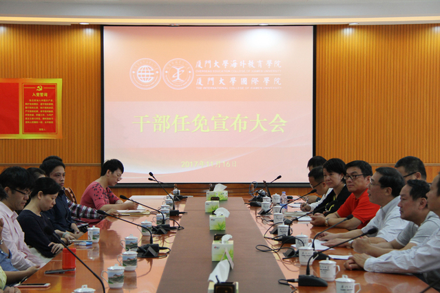 11月16日下午,学校在翔安校区坤銮楼C104召开海外教育学院/国际学院干部任命宣布大会。校党委副书记、副校长李建发在会上宣布了厦门大学党委、校行政的任命决定:任命陶涛担任海外教育学院/国际学院院长、学院党委副书记,郑通涛不再担任海外教育学院/国际学院院长职务。会议由校党委组织部部长梁卫中主持。