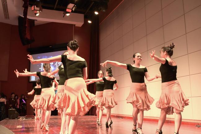 紧接着,郝俊茹同学为全场献上吉他独唱《从前慢》。“从前的日色变得慢,车,马,邮件都慢,一生只够爱一个人。”当木心先生款款的诗歌化作吉他的低吟浅唱与女声的温婉沉静,一切似乎都回到了那个朴素美好的年代,那些故事与画面仍是时光里最美的模样。之后的拉丁舞伦巴表演《喜欢你》让目光聚焦到体育舞蹈协会的演员们身上。何为爱情的舞步?他们这样诠释:是莲步轻摇,是缱绻动人的回眸,亦是裙裾旋扬间似有蛱蝶飞舞——一转一停,尽态极妍;青春情愫,娓娓道来。而一场精彩的演出自然少不了语言类节目的助阵。博乐相声社的三位才子携《朋友之间》而来,他们妙语连珠,诙谐机智而接地气,将朋友之间的微妙逗趣真实演绎,引来全场阵阵欢笑喝彩。灯光渐次闪烁,富有节奏与爆发力的说唱歌词,一切让歌者与观众皆沉醉摇摆。是的,这是马宇驰、吴宇凡、张达三位同学带来的说唱表演《Rocket》——融入流行文化的汉语也可以如此极具青春动感与国际范。三人行,撑全场。无rap,不尽兴。