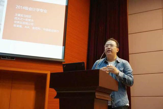 最后一位上台的14级陈家伟学长在现场和大家分享了自己的大学生活。其中,学长说到关于求职最重要的就是——选一份和个人兴趣性格相关令你开心的工作,积累经验使自己了解更多相关行业知识,还要把学过的专业知识努力运用在每一份实习工作上。虽然学长讲得轻松戏谑,但学长的丰富实习经历也是很辛苦地积累起来的。比如在中国银行厦门总行实习时,每天就要花四个小时在路上往返。