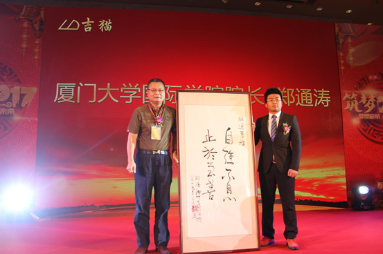 启动仪式上,厦门大学国际学院院长郑通涛教授将亲手题写的厦大校训牌匾赠予吉猫科技,并对林迪先生寄以厚望。希望他能发扬厦大精神,携手国际资源,在公司今后的发展道路上,“自强不息,止于至善”。