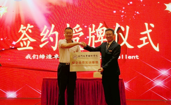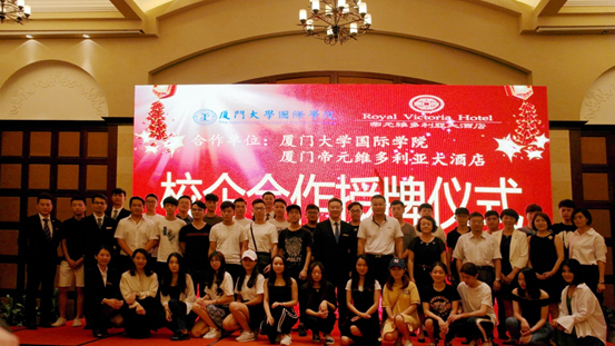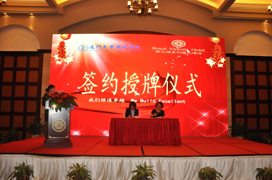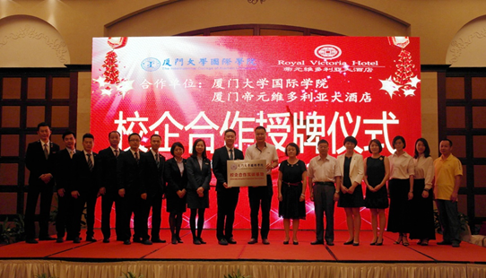 6月9日,厦门大学国际学院与厦门帝元维多利亚大酒店校企合作签约暨揭牌仪式在帝元维多利亚大酒店多功能厅隆重举行,此举标志着我院在促进教学与实践结合方面又迈出了新的步伐。海外教育学院/国际学院院长郑通涛教授、副院长黄冠华老师、办公室主任黄琛老师、厦门帝元维多利亚大酒店常务副总经理林行楚先生、财务总监白晖女士、人力资源总监蔡晓玫女士、市场销售总监杨文洲先生、其它各部门主要负责人及我院酒店管理专业全体师生出席签约仪式。