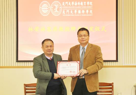 12月30日,深圳市和记润华投资有限公司任公司总裁林荣霖先生受聘担任厦门大学海外教育学院/国际学院客座教授。受聘仪式在坤銮楼B509会议室进行,海外教育学院/国际学院院长郑通涛教授向林荣霖总裁颁发了客座教授聘书,并赠与校徽。